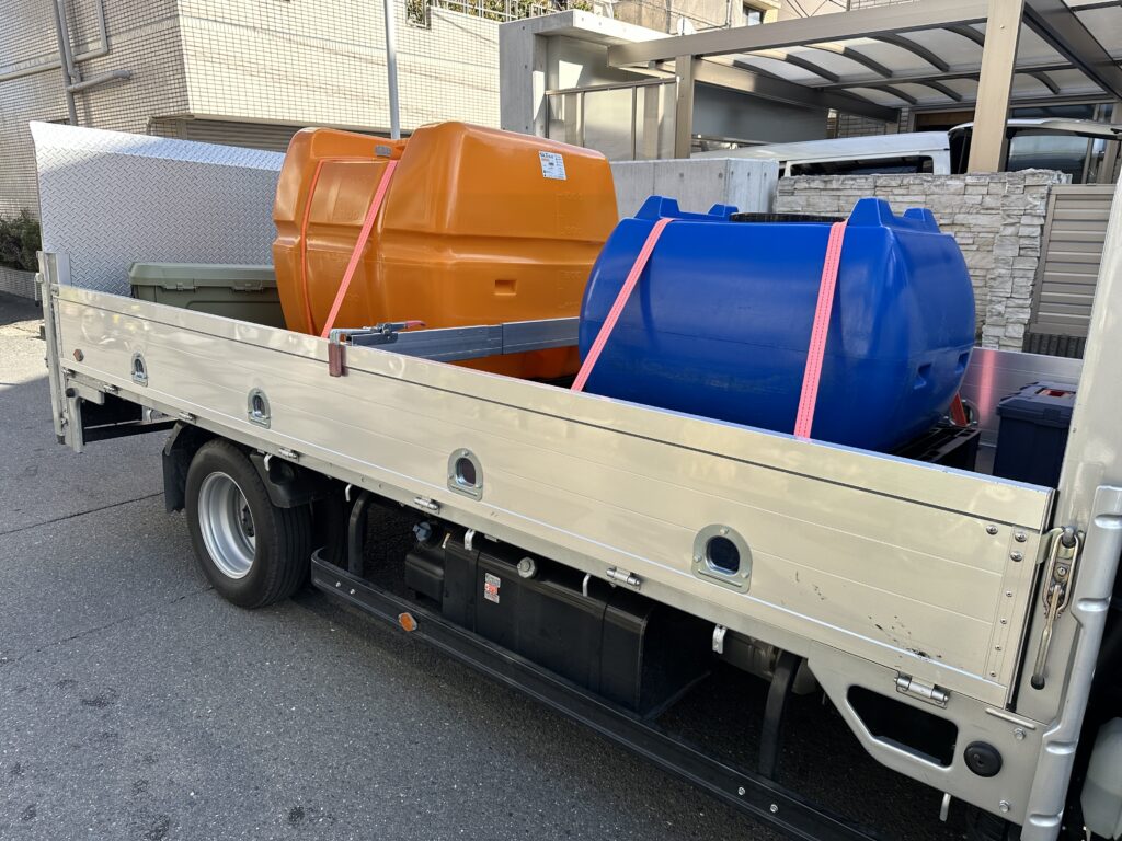 通常、換水は水栓をお借りして注水ですが、このサイズになると水が溜まるまで数時間かかりますので、事前に準備したローリータンクより注水していきます!