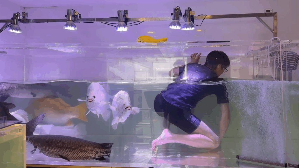 バラマンディとガーに可愛がられながら恐怖のコケ掃除をする健ちゃん♪笑