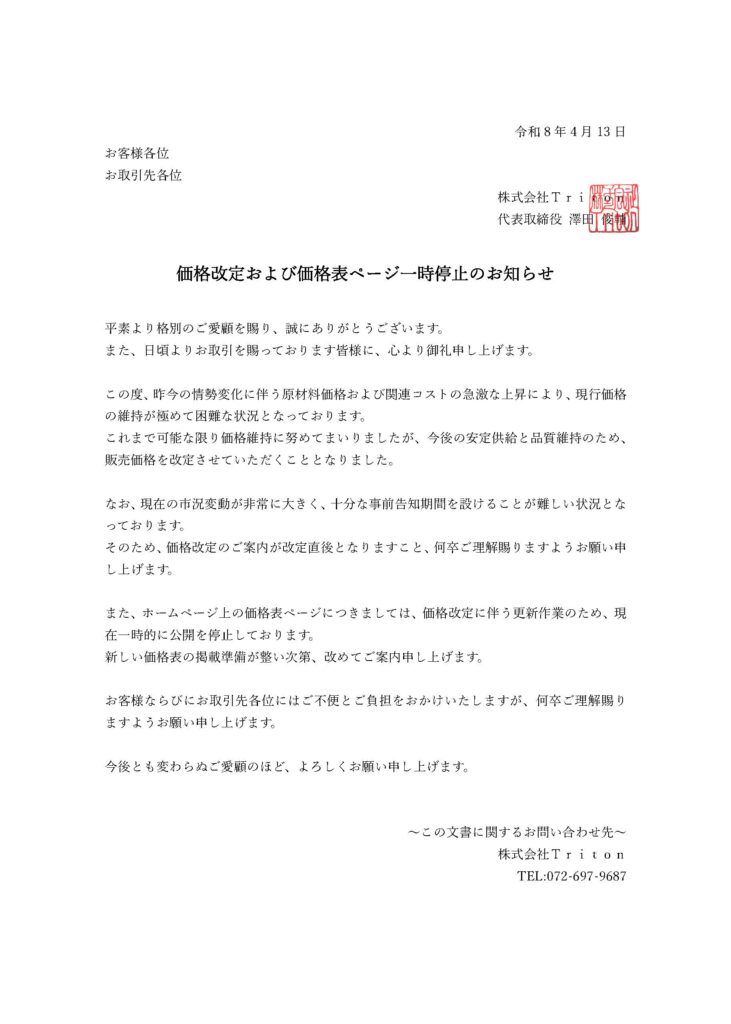 また、ホームページ上の価格表ページにつきましては、価格改定に伴う更新作業のため、現在一時的に公開を停止しております。